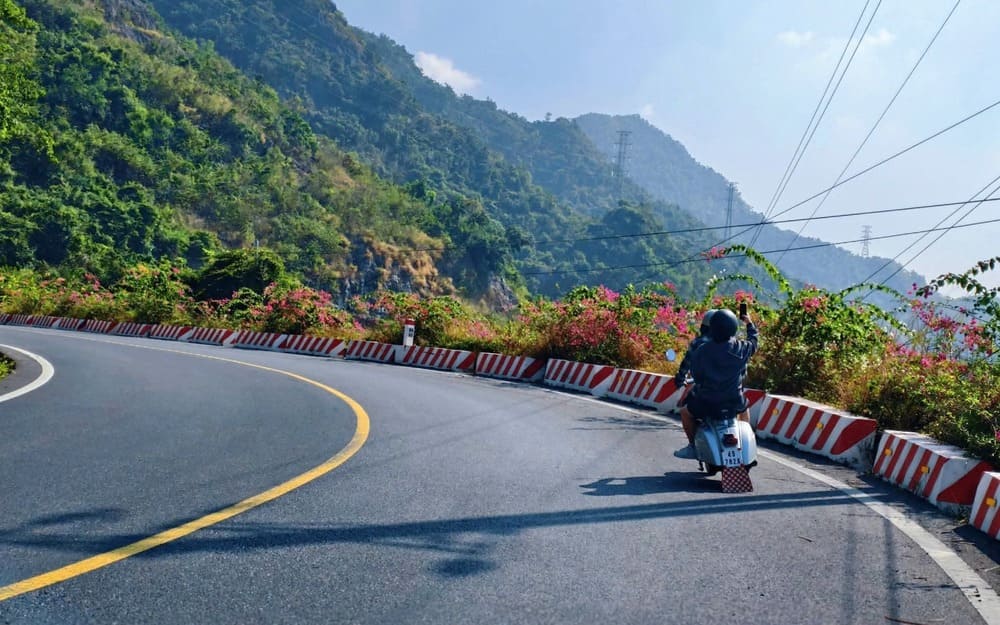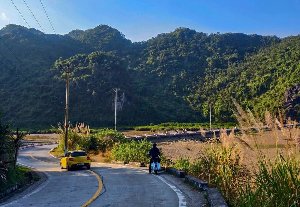 Những con đường ven núi trải dài, ôm trọn sườn đá vôi phủ kín cây rừng, hiện ra trong ánh nắng nhạt của mùa đông. Không khí mát lành, khô ráo, bầu trời cao và trong, khiến mỗi khúc cua trở thành một khung hình nên thơ. Đi xe máy thong dong giữa không gian ấy, người ta dễ cảm nhận được sự giao hòa giữa con người và thiên nhiên, khi tiếng động cơ nhỏ bé lọt thỏm giữa đại ngàn xanh.